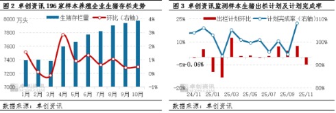 再看生猪存栏方面,10月底生猪存栏量微增。究其原因,从生猪繁育周期逻辑来看,4-5个月前的能繁母猪存栏正处于增长阶段,理论上10月底肥猪存栏应呈显著增长态势。但据卓创资讯调研显示,10月养殖端压栏增重意愿整体偏弱,核心原因在于当月生猪价格缺乏明显上涨动力,业者对后续市场行情信心不足。从出栏进度来看,卓创资讯监测230家样本养殖企业数据显示,10月生猪出栏量达2149.79万头,计划完成率108.08%。且全国各区域均实现超计划出栏,这一现象直观反映出当月养殖端普遍加快出栏节奏、顺势出栏。而这一操作直接抵消了部分理论存栏增量,最终导致10月底肥猪存栏呈现微增态势。