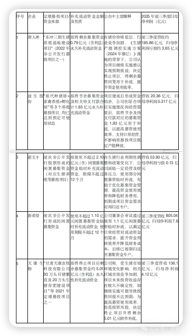 蓝鲸新闻记者梳理上市公司公告发现,从唐人神(002567.SZ)到益生股份(002458.SZ),从新五丰(600975.SH)到新希望(000876.SZ),今年以来至少有5家上市猪企宣布将前次定增募投项目资金“挪作他用”,永久或阶段性补充流动资金。