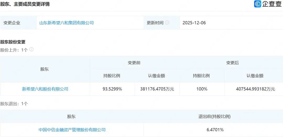 其中,中国中信金融资产管理股份有限公司(下称“中信金融资产”)退出山东六和,其退出前在山东六和的认缴出资为2.64亿元,持股比例为6.47%。新希望(000876.SZ)接手中信金融资产所持山东六合所有股份。目前,新希望对山东六和的认缴出资额为40.75亿元,持股比例为100%。