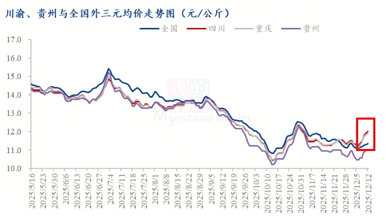 需求的集中爆发直接传导至生猪出栏价格,四川地区生猪价格已连续9日实现上涨,截至12月14日,当地外三元生猪出栏均价达到12.25元/公斤,较9日前的11.23元/公斤累积上涨1.02元/公斤,涨幅达9.08%。这一价格不仅大幅领先全国平均水平,更反超了传统高价区广东,成为当前全国生猪价格最高的省份。
