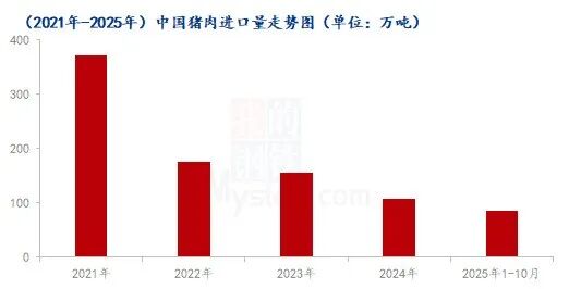 近5年中国猪肉进口量呈现逐年下降趋势,前期由于受非洲猪瘟、环保政策以及公共卫生事件等因素影响,国内猪肉量供应明显下滑,且猪肉价格迅速攀升,吸引国外大量进口猪肉涌入中国,中国猪肉进口明显上升。之后,随着国内生猪产能快速恢复,猪肉供应增加,对进口依赖下降,猪肉进口量亦是逐年下降。从2021年进口量的371万吨已降至2024年的107万吨的低位水平,2024年猪肉进口量占比全国猪肉产量(5706万吨)为1.87%。截至2025年1-10月中国累计猪肉进口量85.9万吨,同比减少3.3%。