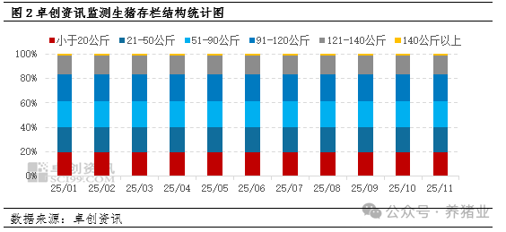 大猪供应的持续充裕,直接压缩了肥猪的溢价空间。据卓创资讯统计,在生猪存栏结构中,11月月末140公斤体重段占比为1.18%,环比增加0.11个百分点,并且已连续两个月呈现增加趋势。前期二次育肥群体集中入场,叠加规模场超计划走货,使得140公斤以上大猪出栏量持续高位,大猪供应增加,其作为腌腊优选原料的特殊性被削弱,与标猪的价格梯度自然难以形成。