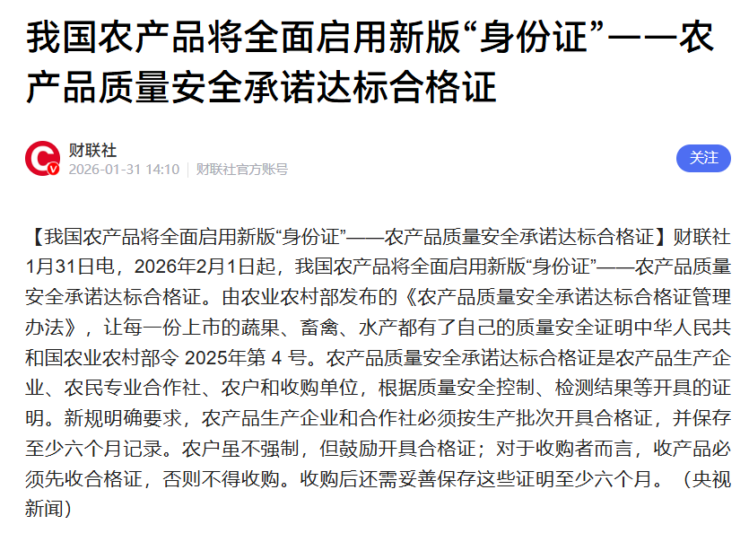2026年2月1日,对于全国所有的养猪场和养猪户来说,是一个需要特别关注的日子。从2月1日起,一项新的国家规定正式开始实施,它悄无声息却又深刻地改变着生猪上市的规则。无论您是把猪卖给附近的收购点,还是交给大型屠宰企业,这批猪都必须带着一张全新的“身份证”——农产品质量安全承诺达标合格证。
