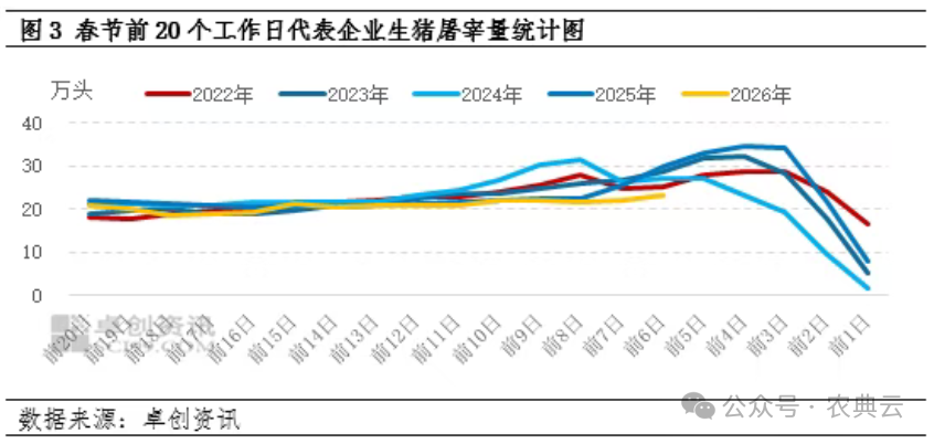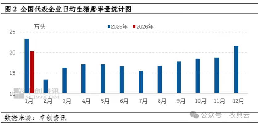 与2025年同期相比,2025年1月份恰逢春节前的备货高峰期,而2026年春节备货高峰期处于2月份。据卓创资讯监测数据显示,1月份代表屠宰企业日均屠宰量同比增幅降幅12.70%。与往年春节前的备货高峰期相比,2026年春节前20个工作日屠宰量增速相对缓慢,同时受亏损影响,屠宰企业放假时间提前。