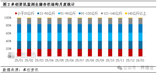 这一走势的核心驱动源于供需结构的分化:一方面,2025年12月腌腊消费高峰期过后,市场中大猪资源持续消化,存栏占比稳步下滑,供应收紧对大猪价格形成有力支撑,使其呈现较强抗跌性。另一方面,养殖端为规避春节后猪价下跌的潜在风险,节前出栏积极性显著提升,标猪供应持续充沛,导致标猪价格表现疲软。一强一弱的价格走势,直接推动1月肥标差环比扩大,这与同期标猪价格跌幅显著大于大猪价格跌幅的市场特征高度契合。