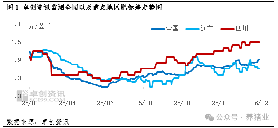 1月全国生猪肥标差呈现稳步走阔态势,成为市场运行的核心亮点。据卓创资讯统计,当月全国肥标差均值达0.77元/公斤,较上月环比上涨0.06元/公斤,涨幅为8.45%,价差呈现扩大趋势。