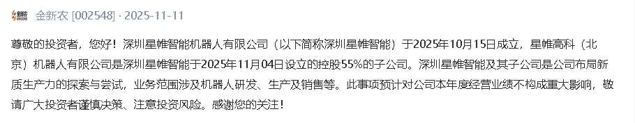事实上,京基智农已经不是第一家杀入机器人赛道的公司。2025年10月15日,金新农也把战略版图延伸到了机器人板块,宣布成立机器人子公司“深圳星帷智能”;并在同年11月4日,正式设立其控股55%的子公司——星帷高科(北京)机器人有限公司。