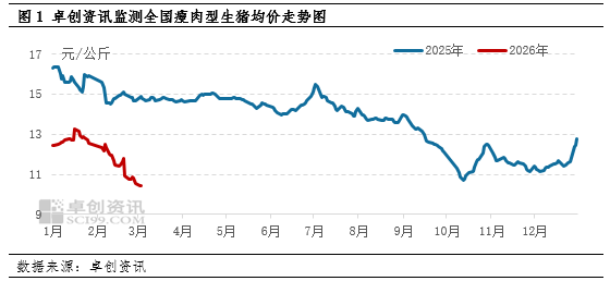 2026年春节后猪价下滑,跌出近年来的新低点。卓创资讯监测,截至3月4日,2026年春节复工后8个工作日的生猪均价为10.69元/公斤,较2025年春节后同期水平下滑4.16元/公斤,跌幅28.03%。其中3月3-4日的生猪价格分别为10.45元/公斤和10.43元/公斤,更是超越2025年10月13日的价格创下了新的低点。春节后需求降至年内冰点,而且养殖企业走货意向强,供大于求态势明显,猪价承压下滑。