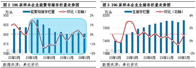 生猪价格下降最直接最根本的原因往往是生猪出栏量,而生猪出栏量则直接受能繁母猪存栏量及生猪存栏量影响。根据卓创资讯监测的196家中大型样本企业存出栏数据显示,2025年能繁母猪存栏量呈先增后减再盘整态势,2026年3-12月份生猪理论出栏量对应2025年5月份-2026年2月份的能繁母猪存栏量,2025年5-6月份能繁母猪存栏量增加,7-9月份回落,此后跌势暂止,对应2026年3-4月份生猪理论出栏量增加、5-7月份理论出栏量减少、此后主线稳定。2026年2月份样本企业能繁母猪存栏量与2025年6月份高点相比仅下滑3.95%,仍未触及去产能的目标。