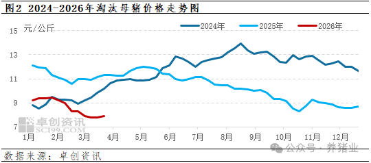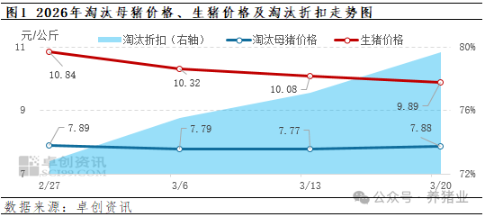 根据卓创资讯监测,3月份生猪价格震荡回落,从每周五的价格来看,猪价持续下探,并于本周五即3月20日跌至低点,为9.89元/公斤,亦为近十五年以来的最低点。在猪价的影响下,淘汰母猪价格下滑概率亦较大。