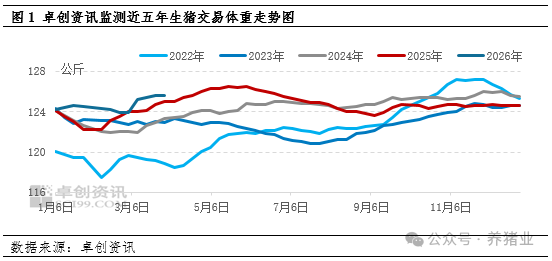 据卓创资讯统计截止到3月19日,全国生猪交易体重为125.55公斤,环比月初增加1.31%,交易不降反增,且处于近五年来的同期最高水平。合2026年3月的生猪市场行情来看,核心是前期库存叠加、养殖端行为和当月市场需求导致的。第一,前期积压库存的延续影响。春节前养殖端降体重的速度就不及预期,不少该出栏的生猪没能及时出栏,这些积压的生猪加上压栏的大猪,在3月集中进入市场,直接拉高了当月生猪的平均体重。第二,养殖户的无奈选择与心态博弈。3月猪价持续低迷,外三元生猪价格一度跌破10元/公斤,养殖端面临养殖亏损挺价心态积极,无形中延缓了体重下降的速度。第三,终端需求不佳导致被动压栏。目前正处于生猪需求传统淡季,生猪消化困难导致被动压栏,最终导致体重不降反增。