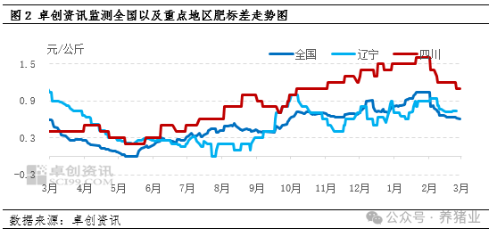 生猪体重偏高直接放大市场供给压力。出栏体重从110公斤提升至130公斤,猪肉供应量可增加18%左右,当前充足的生猪存栏量再叠加体重偏高,导致市场供给过剩,直接压制猪价回升,这也是近期猪价持续下滑的重要原因之一。同时,肥标猪价差持续收窄,据卓创资讯统计截止到3月23日,全国肥标差均值为0.59元/公斤,环比月初下滑18.05%,边际增重利润消失,养殖户进退两难,集中出栏时会进一步压低猪价。