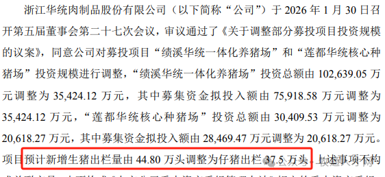 据华统股份1月30日公告,公司要对绩溪、莲都两大生猪养殖募投项目投资规模进行调整,合计缩减投资7.7亿元,并将项目预计新增生猪出栏量由44.80万头调整为仔猪出栏37.5万头。