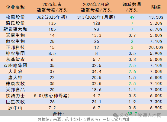 作为行业龙头“大哥”,牧原股份带头响应产能调控。去年公司能繁母猪存栏从362万头持续调减,年末降至323.2万头,到2026年1月底进一步回落至313万头。据上海证券报报道,牧原已在全国范围内停建124个在建养猪场,涉及产能约1200万头。
