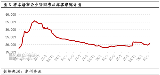 2026年以来,生猪价格不断下降,屠宰企业采购成本低位,但冻品入库积极性仍难有显著提升。截至3月19日,样本企业冻品库容率为20.98%,较春节前上涨1.19个百分点,较2025年同期提升2.26个百分点。屠宰企业对于2026年生猪行情预期同样不乐观,同时,目前多数自营屠宰企业受前期亏损的影响,资金紧张,不支持集中入库。目前增加的冻品,多数为屠宰企业鲜销欠佳导致的被动入库。进入二季度,从生猪采购成本来看,处于屠宰企业分割入库的较好时机,但因屠宰企业预期不足及入库心态谨慎的影响,冻品入库对生猪价格支撑效果或仍十分有限。