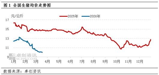 进入2026年以来,生猪价格先涨后降,全国生猪均价由1月4日的12.43元最高涨至1月19日的13.26元/公斤,春节假期过后,生猪价格进入连续下降阶段,截至3月19日,全国生猪均价降至9.98元/公斤,跌破十元关口。