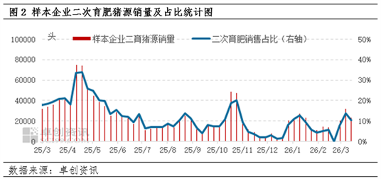 二次育肥渠道作为生猪出栏的缓冲渠道,在补栏环节会减少生猪市场实际供应,出栏环节会增加生猪市场实际供应,但对把握补栏、出栏时间节点要求较高。以2025年为例,二次育肥补栏最高峰出现在4月中旬,4月11日当周样本企业销售至二次育肥渠道生猪销量为75057头,占其总销量比例为33.54%,对应的出栏周期在6月份前后,而出栏周期的生猪价格低于补栏周期,因此2025年二次育肥盈利欠佳,导致2026年二次育肥群体补栏较为谨慎。