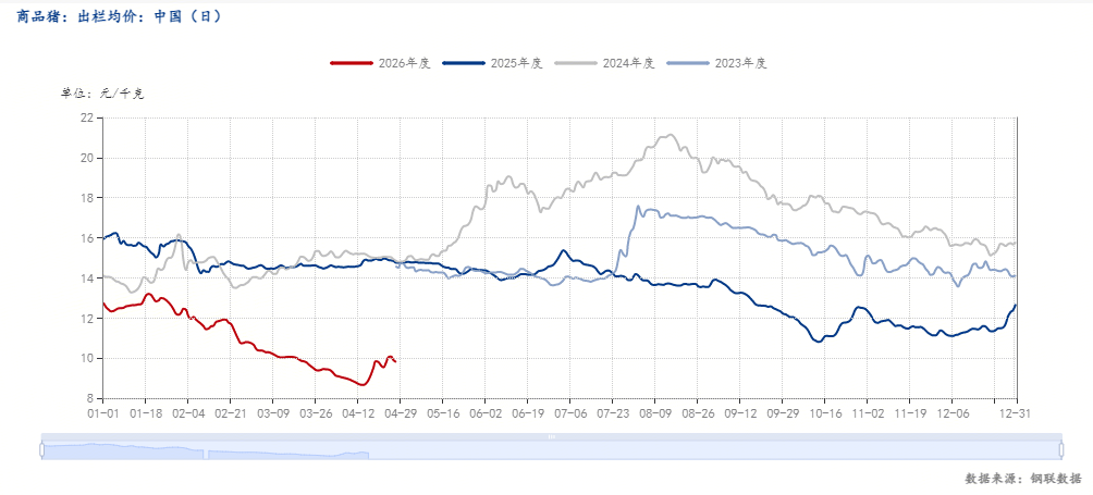 短期来看,猪价仍具备阶段性反弹基础。当前生猪养殖成本主流在12—13元/公斤,自繁自养头均亏损200—300元,养殖端挺价意愿强烈,散户惜售情绪进一步收紧短期供应。4月底规模场出栏计划稳定,部分企业适度缩量挺价;二次育肥与冻品企业低位补库意愿增强,叠加收储预期与节日备货带动,短期猪价偏强震荡,有望试探10.50-11.50元/公斤区间。