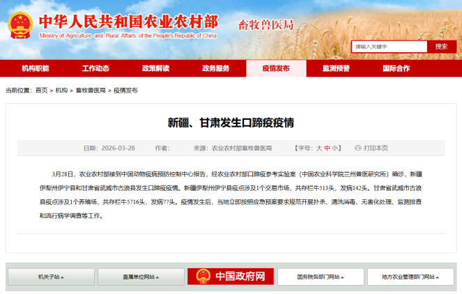 3月28日,农业农村部正式发布疫情通报,明确我国新疆、甘肃两地发生南非1型(SAT-1)口蹄疫疫情。疫情发生后,农业农村部第一时间启动应急响应,一方面督促两地严格按照应急预案要求,有序开展病畜扑杀、环境消杀、疫情排查等处置工作;另一方面紧急启动南非1型口蹄疫应急疫苗的生产工作,全力遏制疫情扩散蔓延。