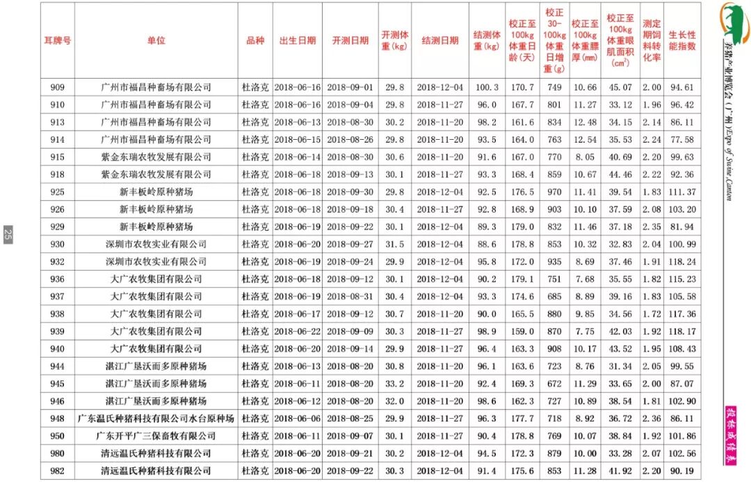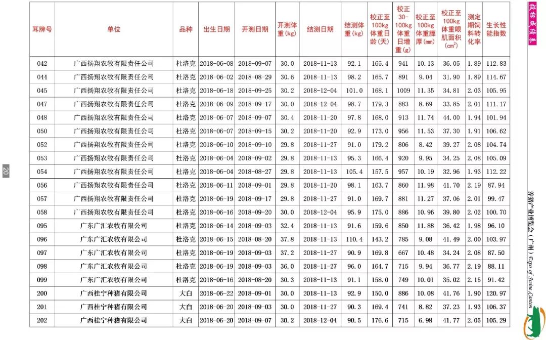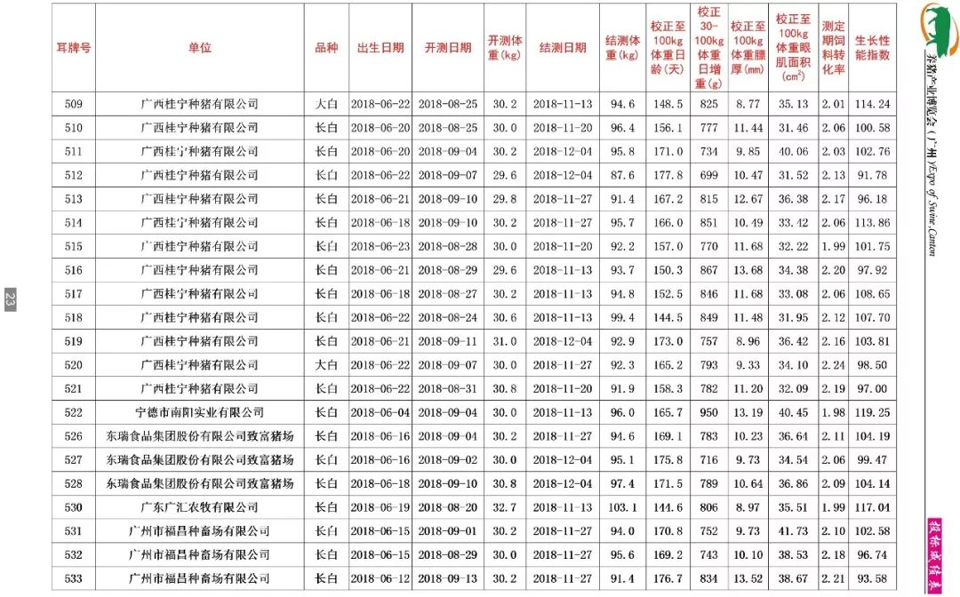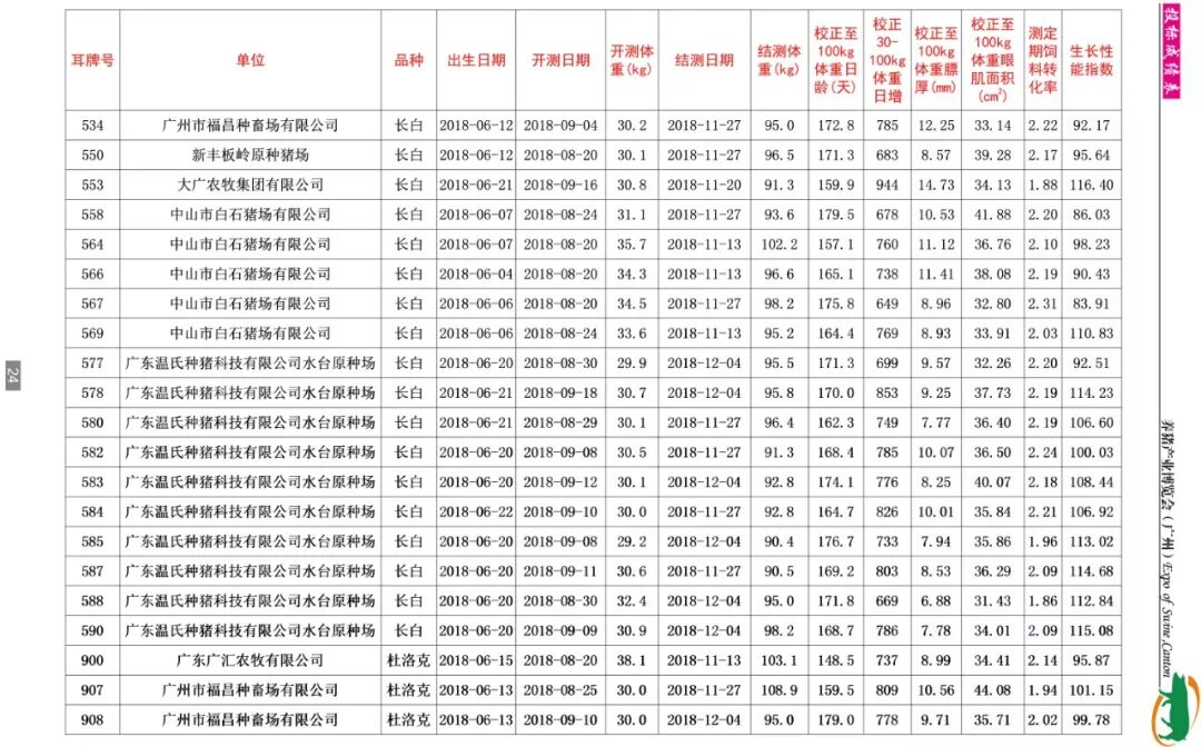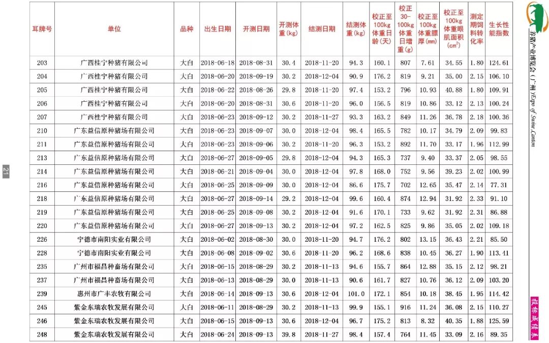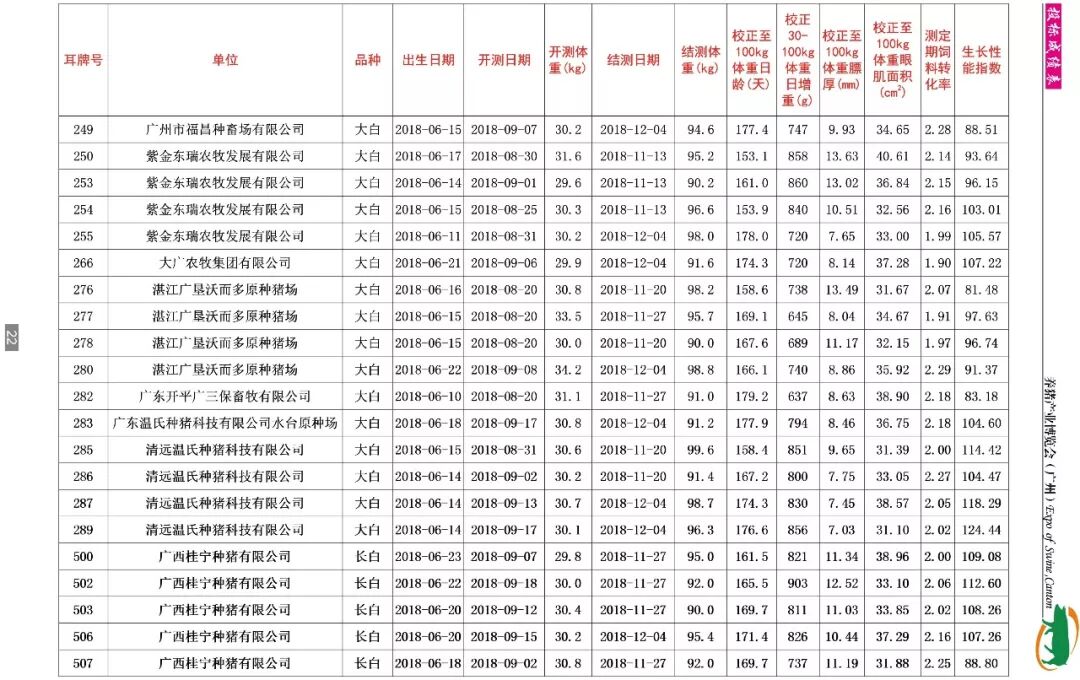 据了解,本期共收测种猪346头,分属杜洛克、大白、长白等多个品种。分别来自广东、广西、福建三省的24家企业,其中国家生猪核心育种场有广东温氏种猪科技有限公司(清远温氏种猪科技有限公司、温氏水台原种场)、东瑞食品集团股份有限公司(致富猪场和紫金东瑞农牧发展有限公司)、广东省惠州市广丰农牧有限公司、深圳市农牧实业有限公司、广东广三保养猪有限公司(开平广三保畜牧有限公司)、肇庆市益信原种猪场有限公司、中山市白石猪场有限公司、广西桂宁种猪有限公司、广西扬翔农牧有限责任公司、宁德市南阳实业有限公司等;另外还有河源兴泰农牧股份有限公司、大广农牧集团有限公司、四会市三乐实业有限公司、广州市良种猪场、湛江广垦沃尔多原种猪场、中山广食农牧发展有限公司、广东广汇农牧有限公司、广州市福昌种畜场有限公司、新丰板岭原种猪场、惠州市源茵畜牧科技有限公司、茂名市菜篮子工程基地顺达种猪场等。