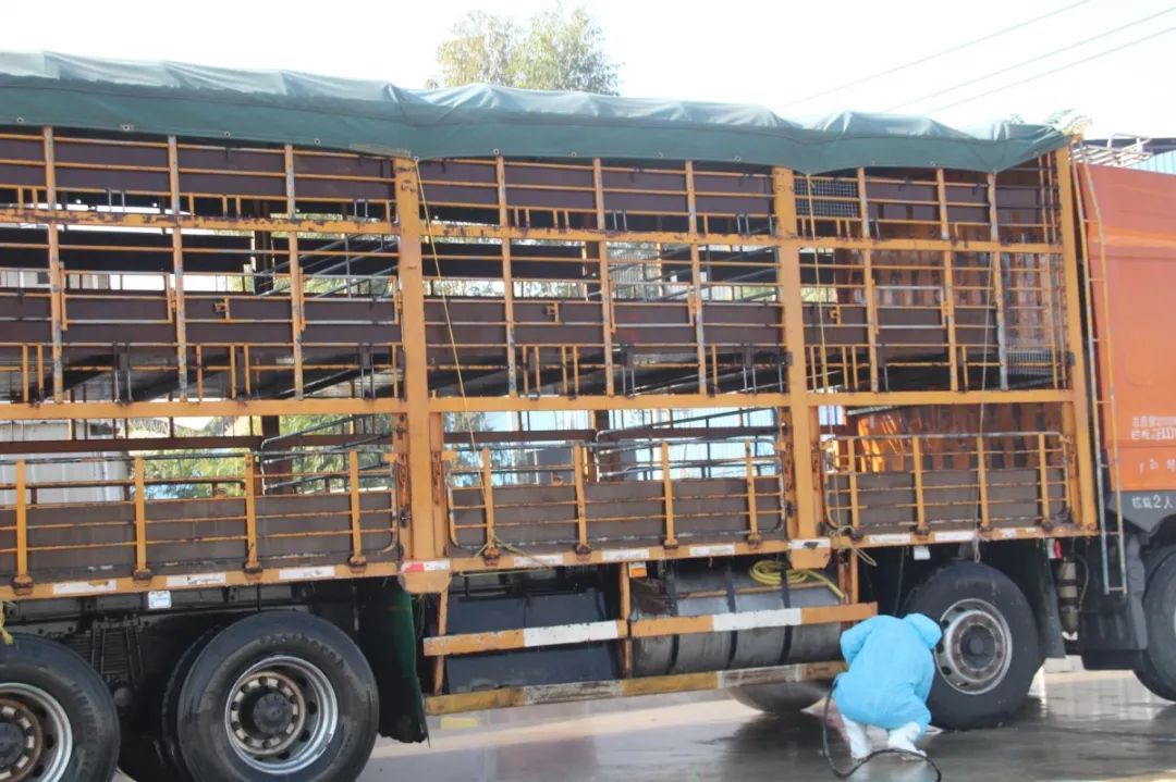 拉猪车是在扬翔总部的防非服务中心洗消合格的内部车辆