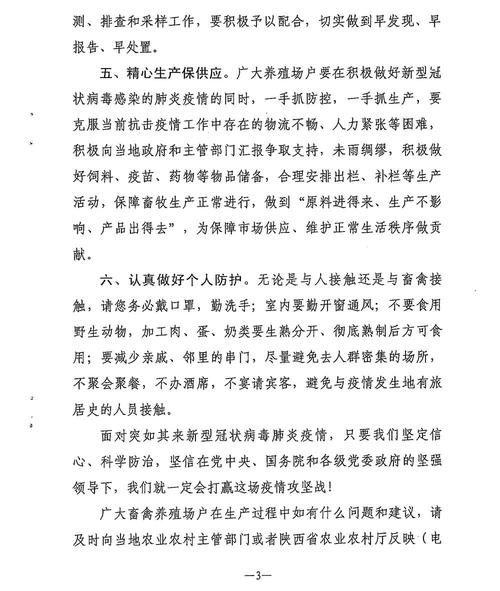 2月1日,陕西省农业农村厅发布致全省畜禽养殖场户的一封信,提醒我省畜禽养殖场户严格遵守关闭活畜禽市场等管理规定,切实做好日常防疫工作,扎实开展养殖环境整治消毒,积极履行疫病监测和报告义务,精心生产保供应,并认真做好个人防护,保护自身生命健康安全、畜牧业健康发展和公共卫生安全。