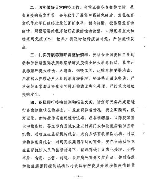 面对冬春交替之际是畜禽疫病高发季节,规模场要按程序做好高致病性禽流感、口蹄疫等重大动物疫病免疫工作,散养户要及时做好疫苗补免,严防疫情发生。扎实开展养殖环境大清洗、大消毒,饲喂工具、运输车辆要勤消毒;严格出入养殖场户人员的消毒和管理;坚决禁止泔水喂猪;严格做好正常淘汰畜禽及其排泄物的无害化处理,严防重大动物疫病发生。对于畜禽健康状况,要每天定期巡查,发现异常情况要立即隔离并做好记录。对病死或死因不明的畜禽,要在当地动物卫生监督执法人员的监督指导下,按规范进行无害化处理,不得宰杀、食用、出售、转运、丢弃病死畜禽及其产品。