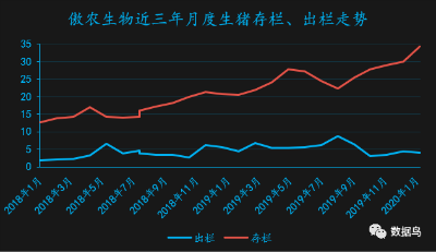 2020年 1月销售生猪 8.72 万头,销售收入 3.83 亿元。其中销售收入环比增长 -32.81%,同比增长 56.97%;销售数量环比增长 -32.51%,同比增长-60.09%;商品 肥猪出栏均重 130.81 公斤,销售均价 35.39 元/公斤。