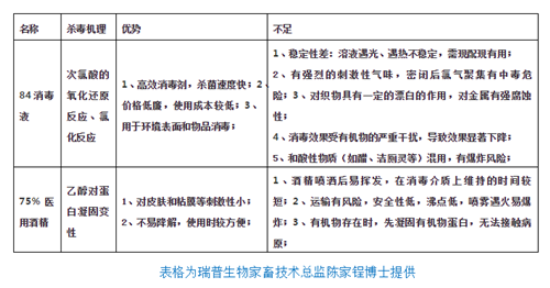 从消毒效果来讲,陈家锃表示,正规的兽用消毒剂类产品的有效性毋庸置疑,甚至比人用的效果还好。如,目前应用较多的84消毒液,其成分、消毒机制和持续时间都是单一的,而兽用的消毒剂,尤其是“复方”消毒剂,有更多的实验数据证明其效果和作用机制。另外,很多人体的传染病病毒评价模型是用动物的病毒去做的,比如SARS病毒,就是以鸡传染性支气管炎病毒作为指示化病毒进行模拟,验证消毒剂的有效性。