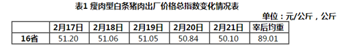 据农业农村部信息中心和山东卓创资讯股份有限公司联合监测,2020年第8周(即2020年2月17日-2月21日,以下简称本周),16省(直辖市)瘦肉型白条猪肉出厂价格总指数的周平均值为每公斤50.85元,环比跌0.7%,同比涨212.2%。