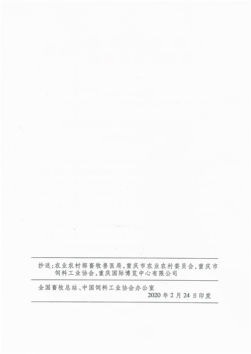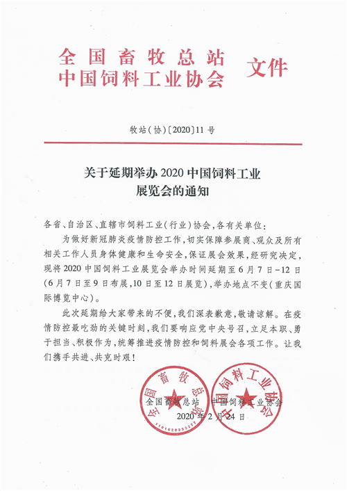 为做好新冠肺炎疫情防控工作,切实保障参展商、观众及所有相关工作人员身体健康和生命安全,保证展会效果,经研究决定,现将2020中国饲料工业展览会举办时间延期至6月7日-12日(6月7日至9日布展,10日至12日展览),举办地点不变(重庆国际博览中心)。