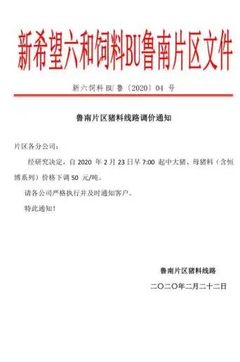 据不完全统计,这波降价也是首先从山东开始,猪料禽料都有下调价格。据了解示,新希望六和鲁南片区猪料中大猪、母猪料价格下调50元/吨。