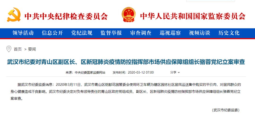 据武汉市纪委监委消息,2020年3月11日,武汉市青山区钢都花园管委会使用环卫车辆为辖区园林社区居民运送集中购买的平价肉,对居民群众的身心健康造成不良影响。