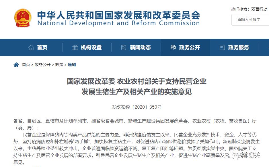 3月16日,发改委与农业部联合发出通知《国家发展改革委 农业农村部关于支持民营企业发展生猪生产及相关产业的实施意见》。