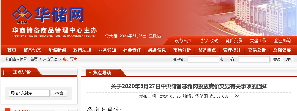 3月25日,华储网发布通知称,华商储备商品管理中心有限公司将出库投放中央储备冻猪肉竞价交易2万吨,交易时间为3月27日下午13时至16时。
