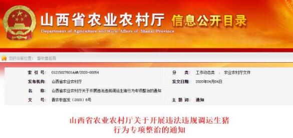 山西省农业农村厅4日下发《关于开展违法违规调运生猪行为专项整治的通知》,决定自即日起至6月1日,集中开展违法违规调运生猪行为专项整治。