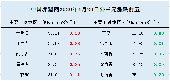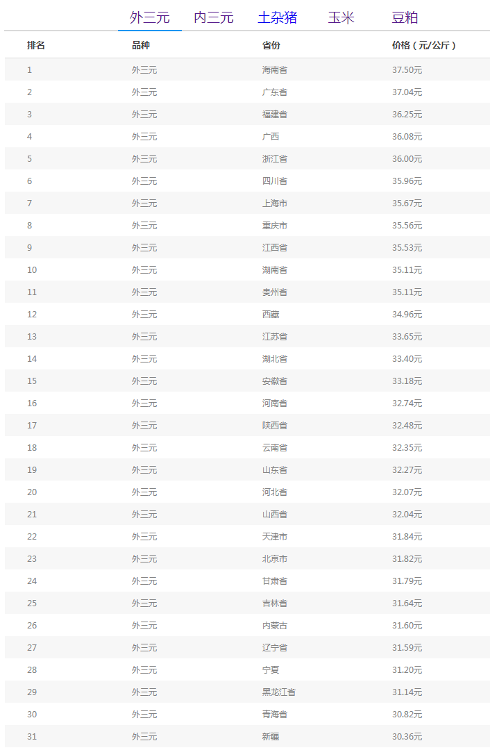 从外三元排行榜来看,海南省今日猪价持平,广东省与之生猪差价在0.46元/公斤。其他排行前十名的地区猪价均在35元以内。