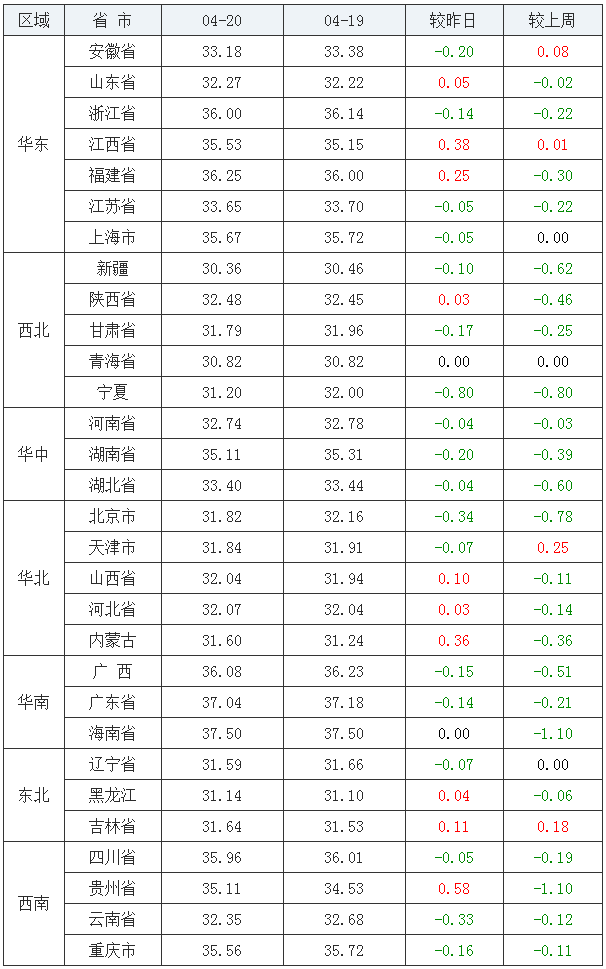 今日猪价最高地区为海南省37.50元/公斤,猪价最低地区为新疆维吾尔自治区30.36元/公斤。