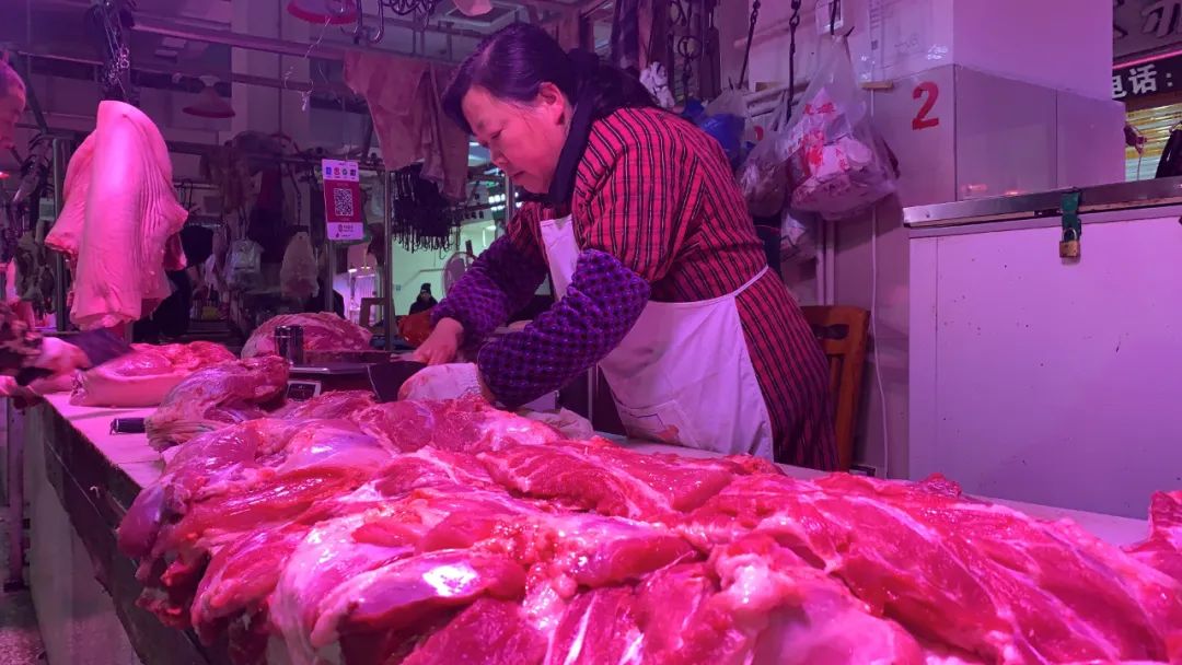 不仅在北京,全国其他地区对猪肉打光“美颜”也十分普遍。在四川省绵阳市最大的菜市场之一——鼓楼市场,十几家连在一起的猪肉档口,无一例外地打着红光。