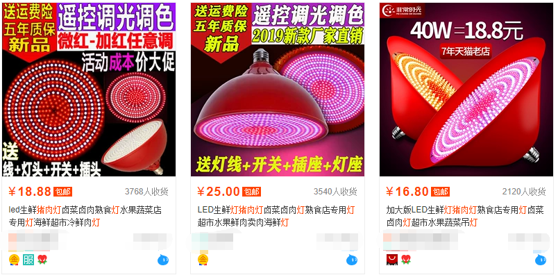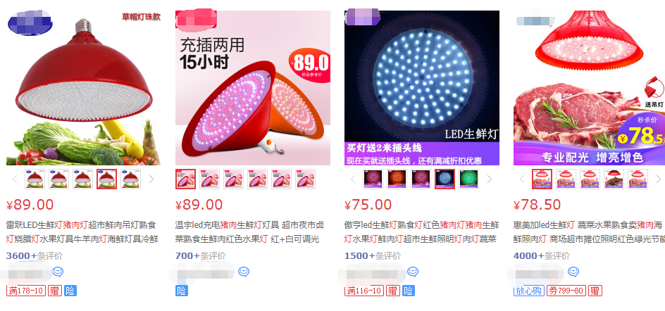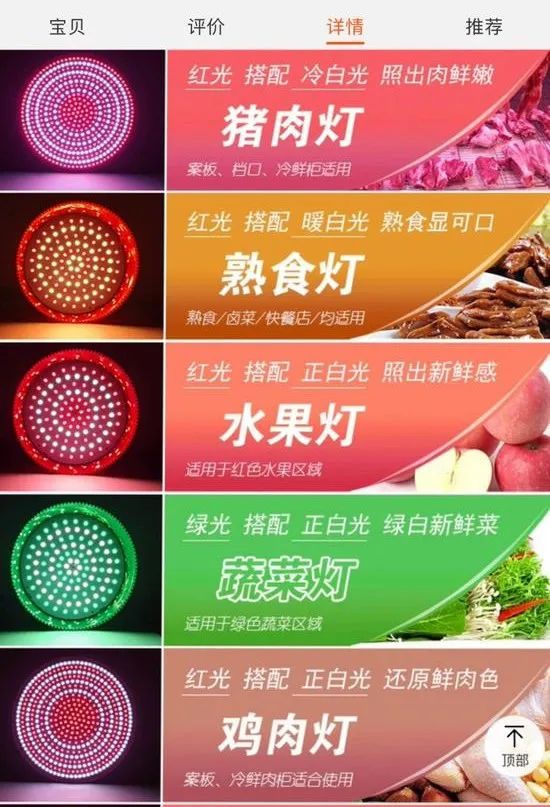 电商平台上商家的产品介绍中,除了使用前后鲜明的效果对比图外,通常还会给出具体的用灯指导,如猪肉灯是红光搭配冷白光,熟食灯是红光搭配暖白光,水果灯是红光搭配正白光,蔬菜灯是绿光搭配正白光,鸡肉灯是红光搭配正白光,冷鲜柜则用冷白光。
