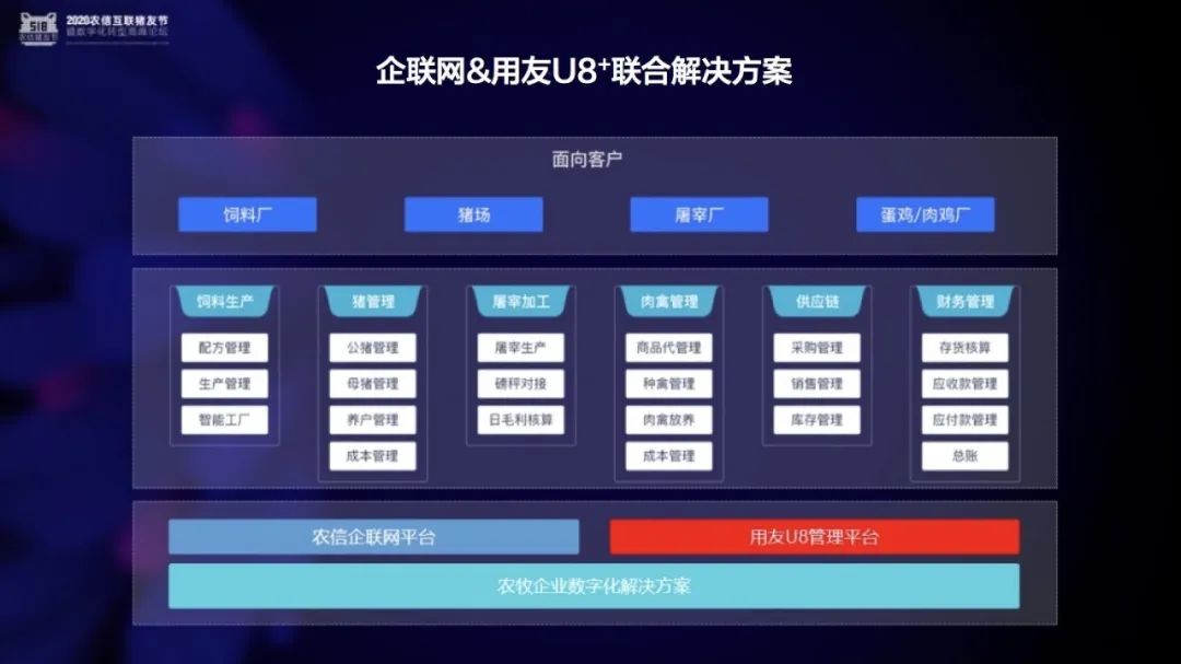 企联网&用友U8+联合解决方案,整合了农信互联企联网与用友U8+产品及解决方案能力,为农牧行业提供一体化解决方案。方案连接猪场生产、智慧财务、供应链及人力管理,使业务和财务无缝对接,让业、财、税成为闭环,全面提升企业数字化能力。