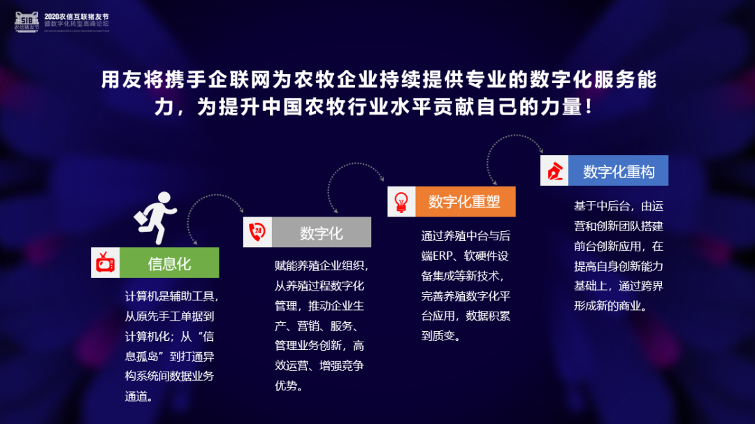 2020年5月18-20日,农信互联首次以网络直播的方式召开“‘数智赋能 疫后腾飞’2020年农信互联518猪友节暨数字化转型高峰论坛”。主论坛以“数字企业”为主题,于5月20日举行,用友网络助理总裁孙汉明受邀出席,探讨农牧企业的数字化实践。会上,双方发布了全新的《企联网&用友U8+联合解决方案》。