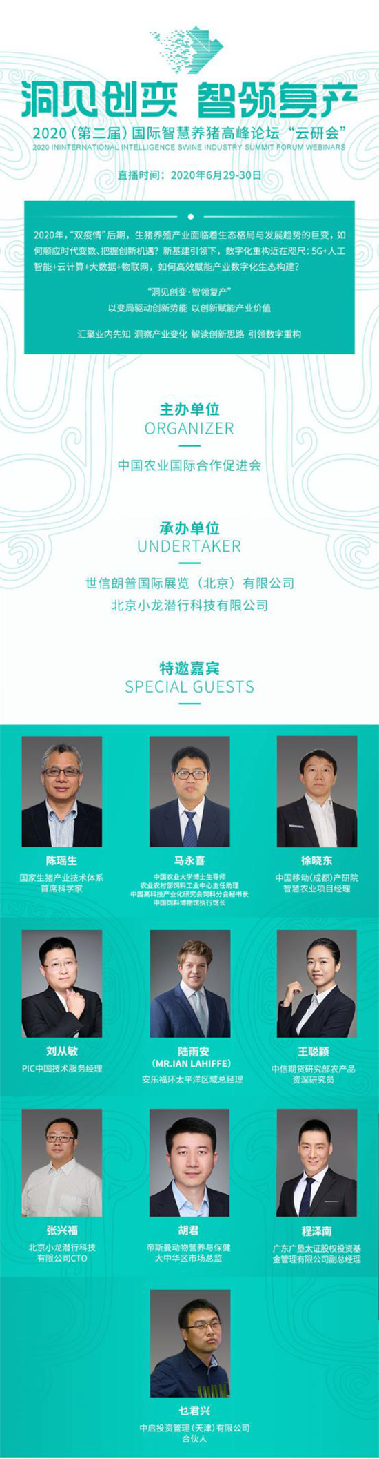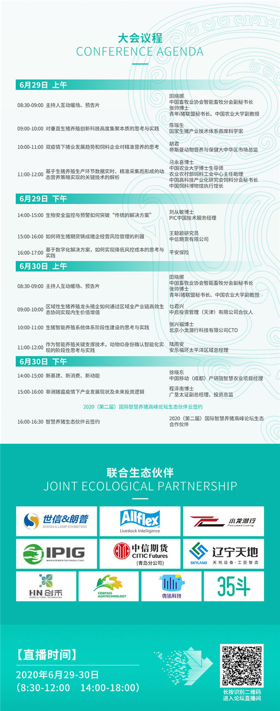 6月29-30日,“洞见创变·智领复产”2020(第二届)国际智慧养猪高峰论坛“云研会”即将启幕,我们期待与您相聚直播间,携手实现猪业复兴、共创行业价值!