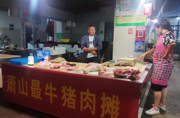 楼家肉铺的摊位前拉着一条横幅,“未来萧山最牛猪肉铺”。小楼告诉记者,自己是这里第一家支付宝数字小店,很多摊位都来取经。最近,她还和旁边的菜摊一起报名了消费券活动,准备联合经营,捆绑满减,并开拓了“菜肉搭售”的净菜配送模式,“帮菜摊也带带生意”。