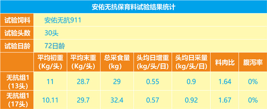 使用安佑无抗教槽料,小猪25日龄断奶后平均日增重比较理想,小猪拉稀少,腹泻率处于可控范围内,料肉比低,经济效益高。使用安佑无抗保育饲料适口性好,皮毛光顺,没有腹泻,增重效果不错 ,内三元达到这个成绩相当满意。在没有使用安佑无抗饲料之前,没想到饲料中不添加抗生素也可以把猪养好。