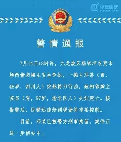 据平安重庆消息,7月14日13时许,九龙坡区杨家坪农贸市场两猪肉摊主发生争执,一摊主邓某(男,45岁,四川人)突然持刀行凶,致相邻摊主苏某(男,57岁,渝北区人)夫妇死亡。接报警后,民警迅速赶到现场将邓某控制。