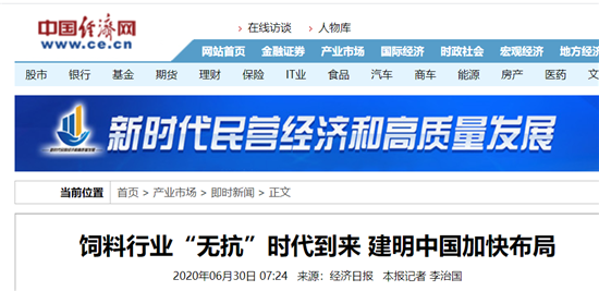 6月30日,在“点亮无抗进行时”直播中,建明中国总裁甘智林博士向参与活动的3600多名行业人士发表了无抗时代的观点。同一天,甘总此前接受《经济日报》采访的内容见报,他介绍了过去三个月里建明的无抗倒计时活动,以无抗解决方案为载体,支持饲料养殖企业在无抗时代的发展。