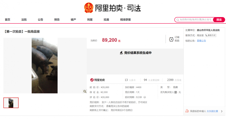 8月8日,一场特殊的拍卖在阿里拍卖平台上结束,这次拍卖的物品不是房产、汽车或奢侈品,而是62头生猪。此前,申请执行人在定价询问时称,“因为老母猪肉老,小公猪的肉有味道,所以这批猪并不值钱。”没想到,经过24小时的拍卖,这批生猪被拍出8.92万元。
