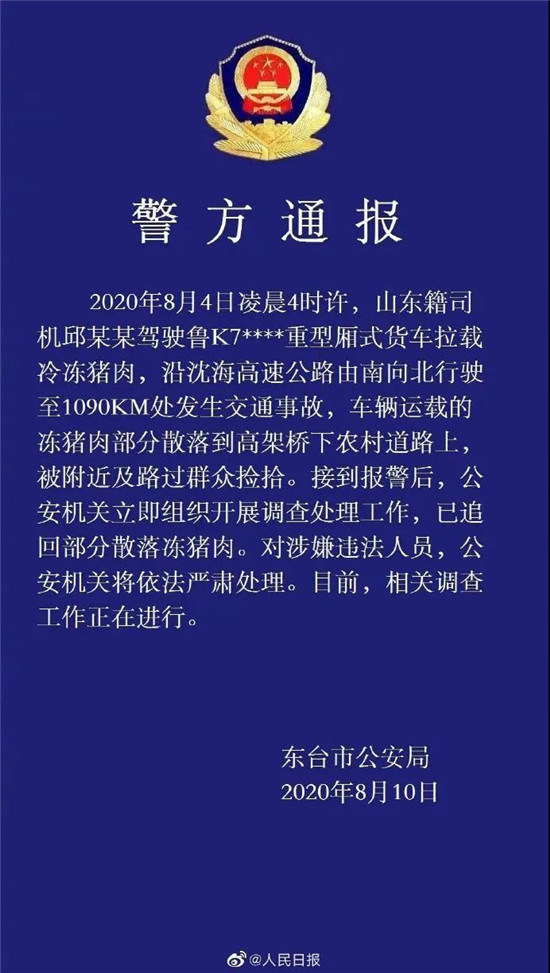8月10日15时许,江苏盐城东台市公安局官方微信公众号盐城东台公安微警务发布警方通报称:2020年8月4日凌晨4时许,山东籍司机邱某某驾驶鲁K7****重型厢式货车拉载冷冻猪肉,沿沈海高速公路由南向北行驶至1090KM处发生交通事故,车辆运载的冻猪肉部分散落到高架桥下农村道路上,被附近及路过群众捡拾。接到报警后,公安机关立即组织开展调查处理工作,已追回部分散落冻猪肉。对涉嫌违法人员,公安机关将依法严肃处理。目前,相关调查工作正在进行。