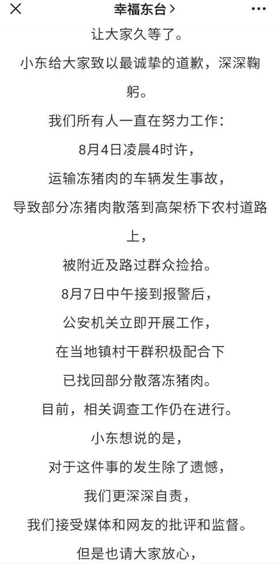 10日晚间,澎湃新闻记者注意到,东台市委宣传部官方微信公众号刊文《真诚致歉》:“让大家久等了。小东给大家致以最诚挚的道歉,深深鞠躬。我们所有人一直在努力工作:8月4日凌晨4时许,运输冻猪肉的车辆发生事故,导致部分冻猪肉散落到高架桥下农村道路上,被附近及路过群众捡拾。8月7日中午接到报警后,公安机关立即开展工作,在当地镇村干群积极配合下已找回部分散落冻猪肉。目前,相关调查工作仍在进行。”